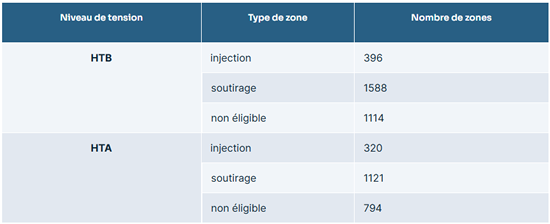 En application des dispositions des TURPE 7, RTE et Enedis ont transmis à la CRE un projet de liste de zones de soutirage et de zones d’injection. Afin de rendre cohérentes les listes des zones en HTA et en HTB et de les mettre en adéquation avec les contraintes globales pour le réseau, la CRE considère qu’il est pertinent d’étendre la définition des zones d’injection en HTA. La CRE retient ainsi le nombre de zones présenté dans le tableau suivant :