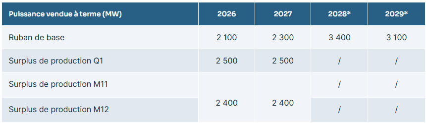 Concernant les années de livraison 2026 et 2027, pour lesquelles les ventes sont déjà largement entamées, la CRE maintient la stratégie retenue jusqu’à présent, ayant pour objectif de vendre à terme un volume ne dépassant pas la production réelle des installations soutenues plus de 90% du temps (précédemment appelée « puissance quasi-certaine »).