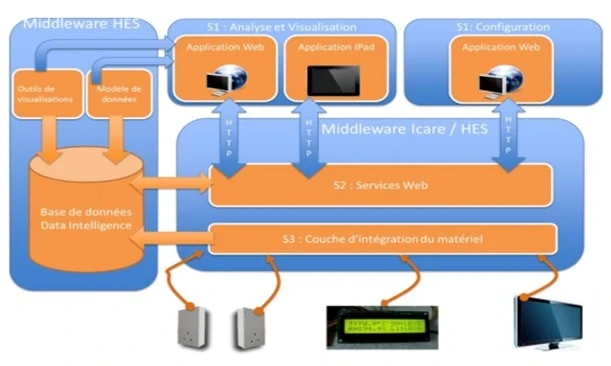 Le système d’information i-BATS nécessite plusieurs étapes de travail. Premièrement, il s’agit de collecter les données aux différents points de consommations, du transformateur basse tension au consommateur final. Tout d’abord, la puissance active et réactive est mesurée au niveau du transformateur à partir des Smart meters. Le même système est utilisé pour les panneaux photovoltaïques et pour mesurer la puissance active et réactive à l’entrée de chaque bâtiment qui composent ce microgrid. Des capteurs placés sur chaque compteur des plus gros consommateurs du Techno-Pôle permet de mesurer la puissance active. Enfin, des mesures sont réalisées à l’intérieur des entreprises. Dans les locaux de la HES-SO Valais-Wallis, la température intérieure, le débit d’eau entrant et sortant du système de régulation de la température, l’intensité lumineuse, la détection de présence, la gestion des stores et la puissance active des appareils sont collectés. Dans ce cas, ces capteurs utilisent les protocoles de communication KNX et Zigbee. Une station météorologique est connectée au système d’information i-BATs pour récolter des données sur la température extérieure et intérieure, l’humidité, la pression ainsi que l’intensité lumineuse. Le pas de mesure pour l’ensemble de ces Smart meters est la seconde. Enfin, une interface permet la visualisation des données de consommation et de monitoring de l’ensemble des capteurs et ainsi programmation (API) permet un accès facile aux données récoltées (cf. Figure 2).