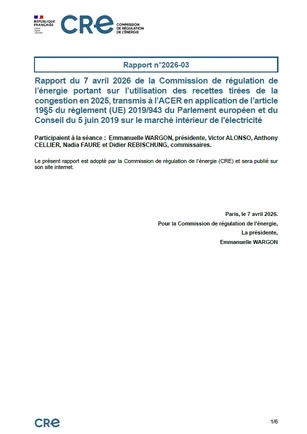 Rapport du 7 avril 2026 de la Commission de régulation de l’énergie portant sur l’utilisation des recettes tirées de la congestion en 2025, transmis à l’ACER en application de l’article 19§5 du règlement (UE) 2019/943 du Parlement européen et du Conseil du 5 juin 2019 sur le marché intérieur de l'électricité